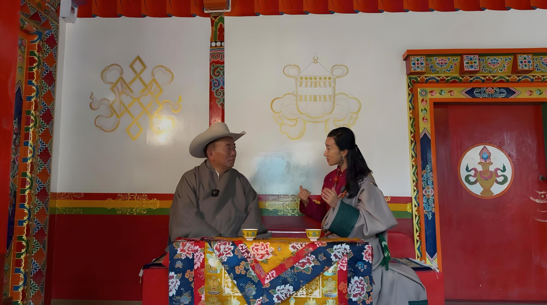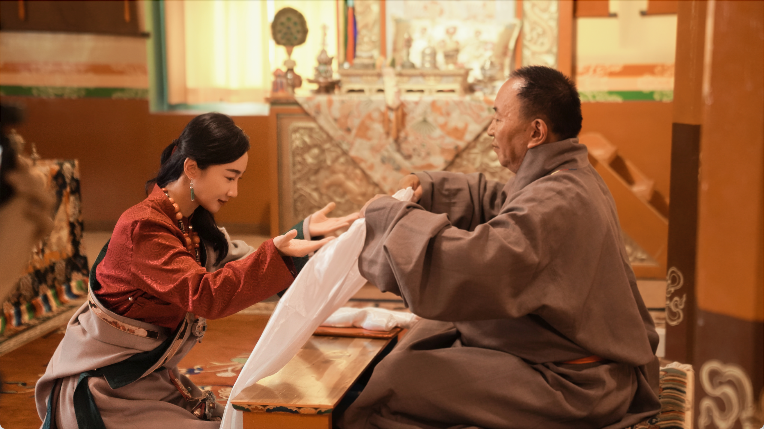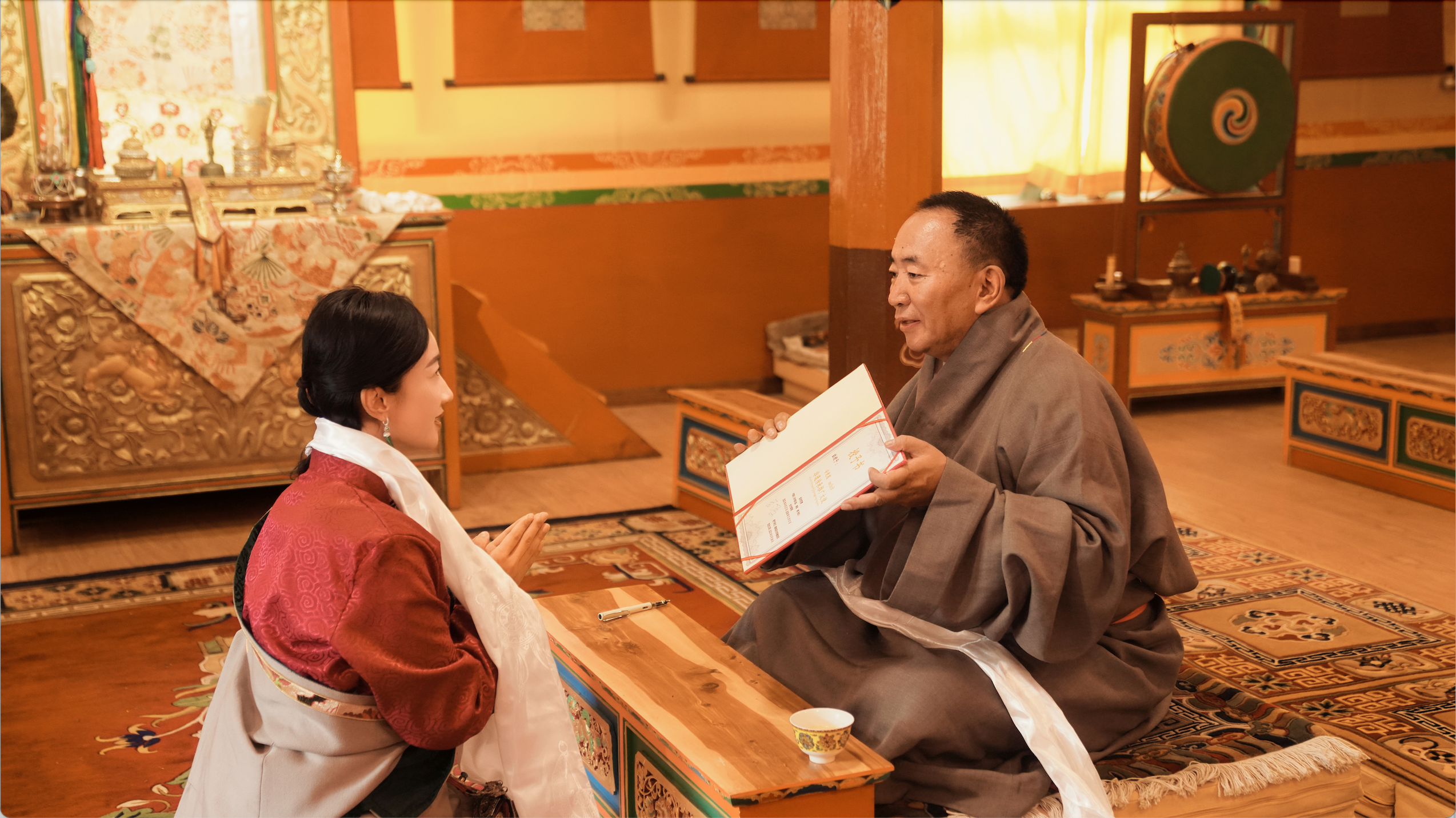 在寺院莊嚴的經堂內,一場簡單而隆重的拜師儀式開始了。安安總身著藏裝,虔誠地向噶布院長敬獻哈達、清茶,行拜師禮。這一刻,空氣仿佛凝固,所有人的心中都充滿了敬畏之情。