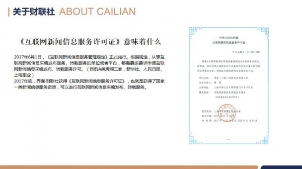 2017年底,界面·財聯社獲得《互聯網新聞信息服務許可證》,也就是獲得了國家一類新聞信息服務資質,可以進行互聯網新聞信息采編發布、轉載服務。